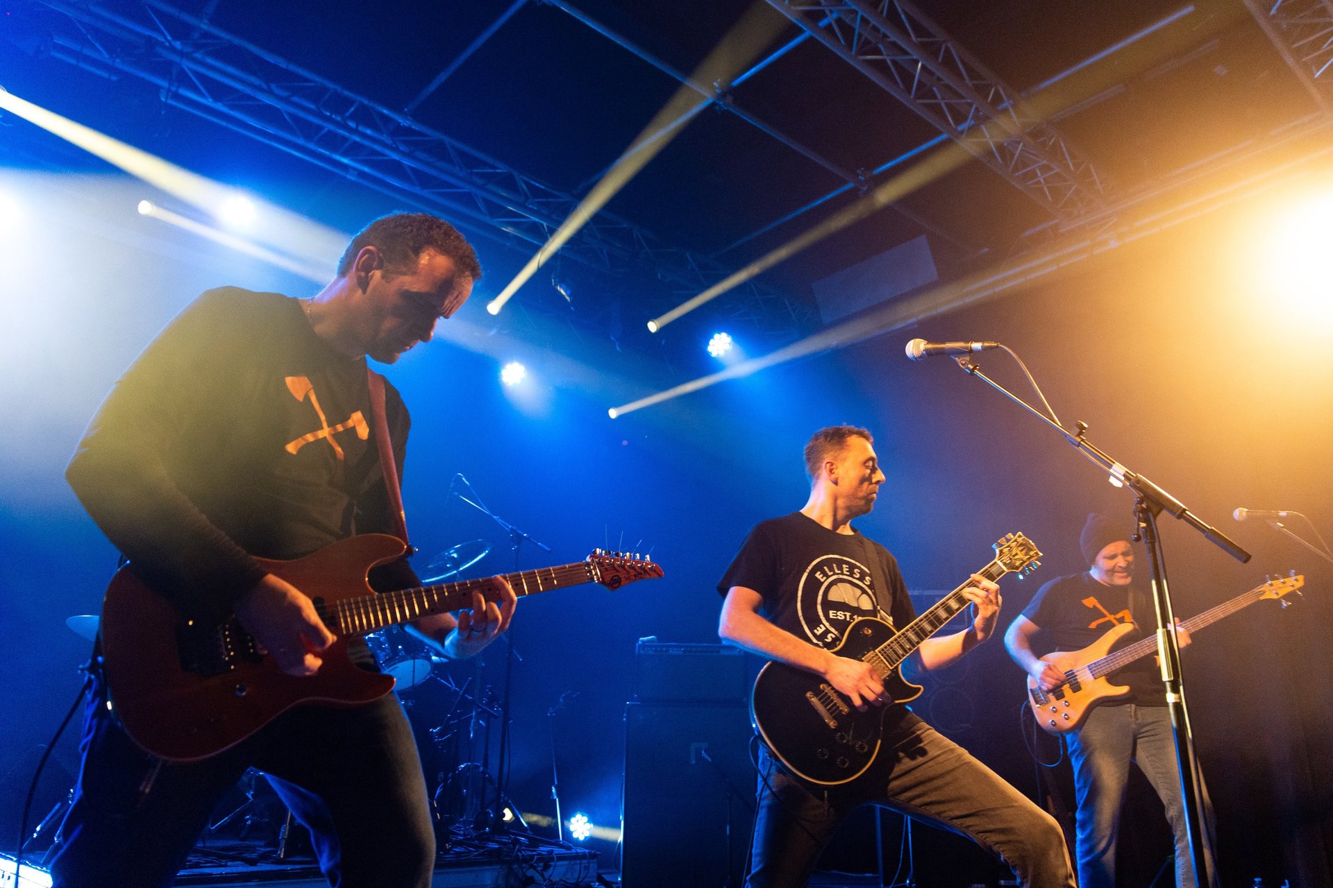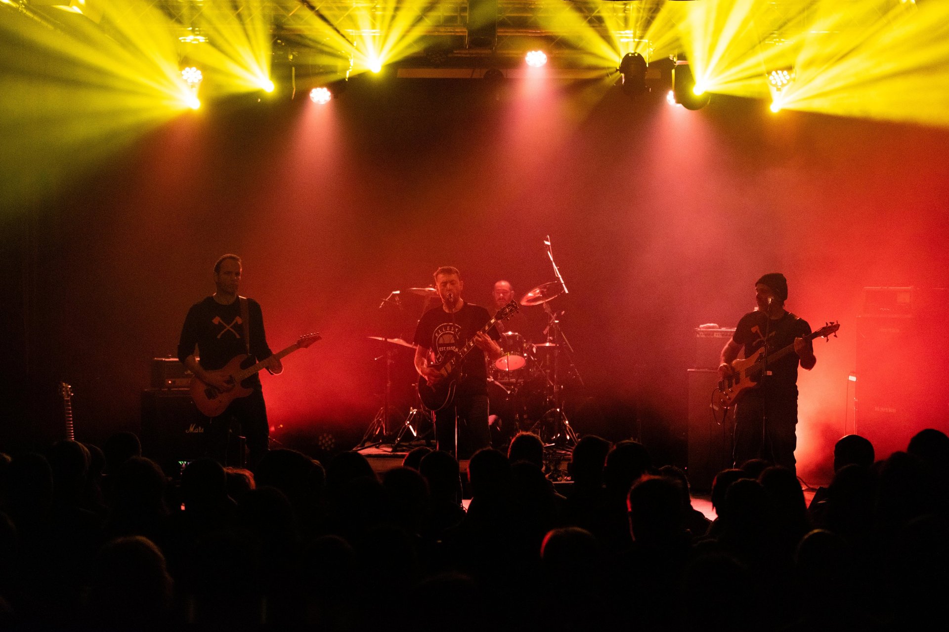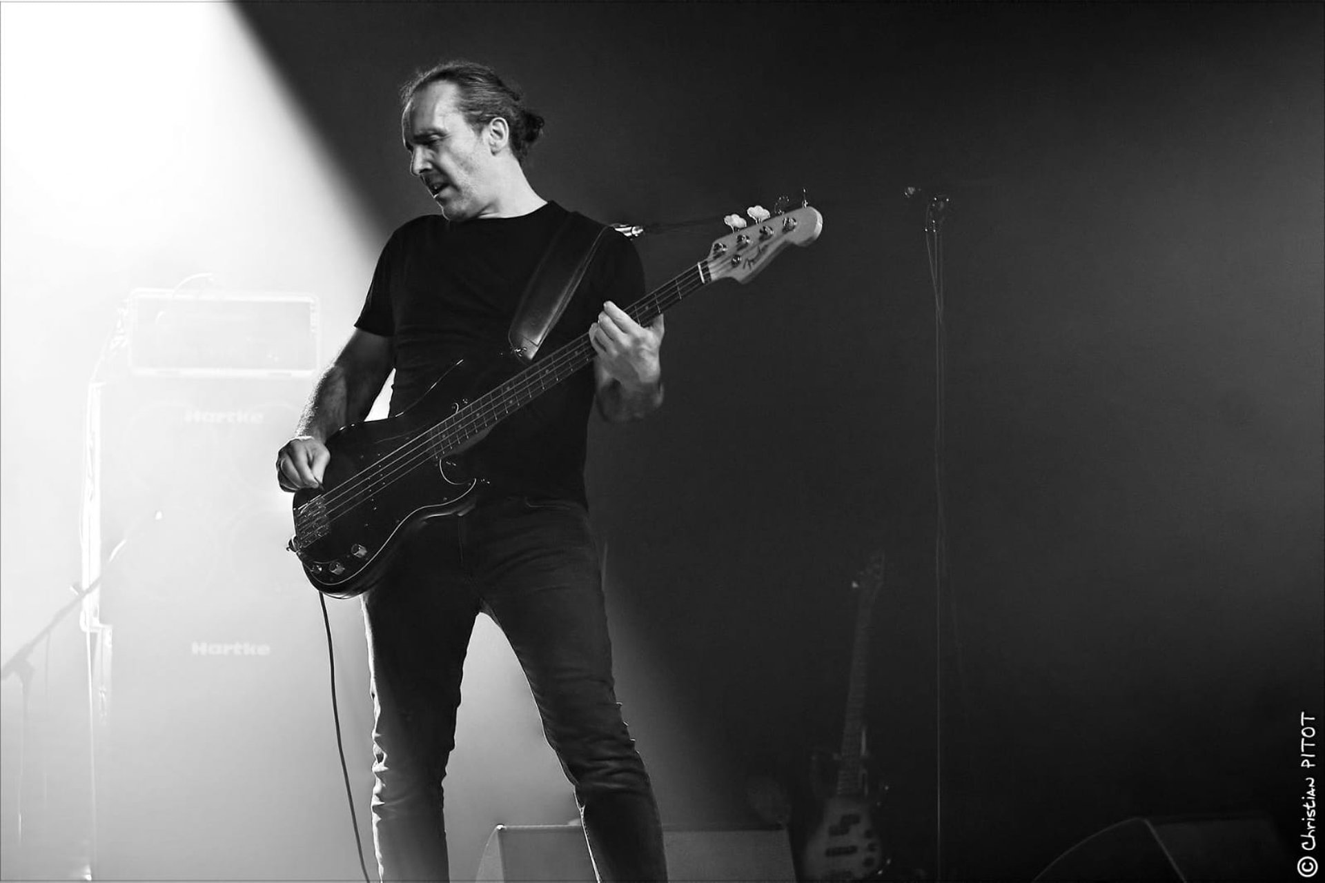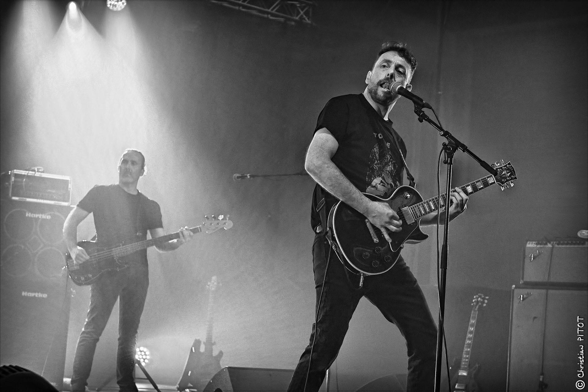 Avec Laurent à la basse et Bruno à la batterie, la coordination entre Tof et Nan's façonne le cœur musical du groupe. Leurs guitares se répondent en écho, se complétant de manière saisissante, que ce soit sur des passages agressifs ou des envolées plus aériennes. Tof, malgré sa présence plus réservée, parvient à captiver le public par son jeu précis et énergique, laissant chaque note résonner avec une puissance brute.